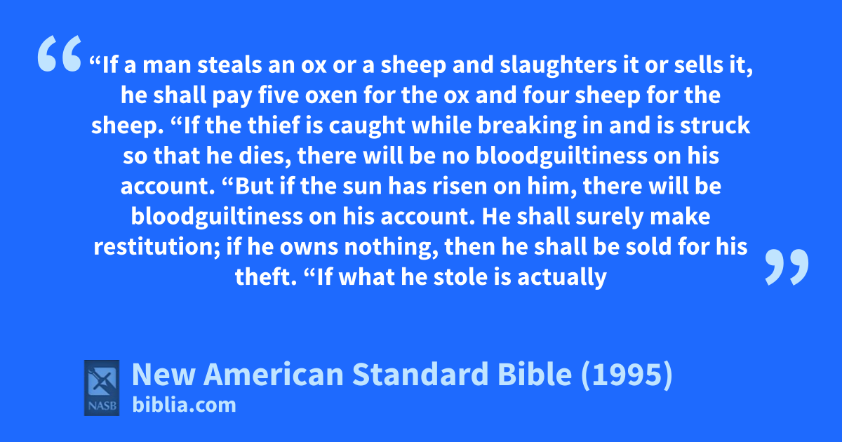 1 “1If a man steals an ox or a sheep and slaughters it or sells it, he shall pay five oxen for the ox and afour sheep for the sheep.