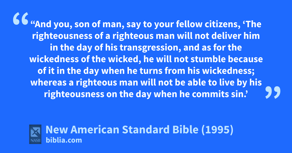 12 “And you, son of man, say to 1your fellow citizens, ‘The arighteousness of a righteous man will not deliver him in the day of his transgression, and as for the wickedness of the wicked, he will bnot stumble because of it in the day when he turns from his wickedness; whereas a righteous man will not be able to live 2by his righteousness on the day when he commits sin.’
