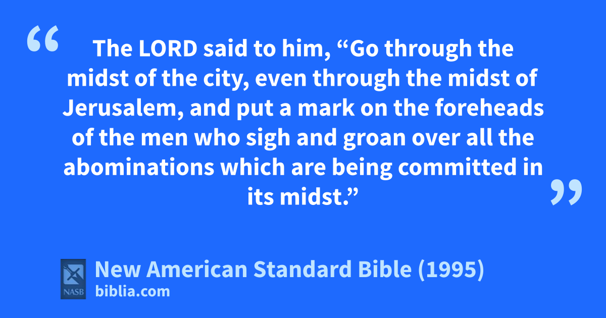 4 The Lord said to him, “Go through the midst of the city, even through the midst of Jerusalem, and put a amark on the foreheads of the men who bsigh and groan over all the abominations which are being committed in its midst.”