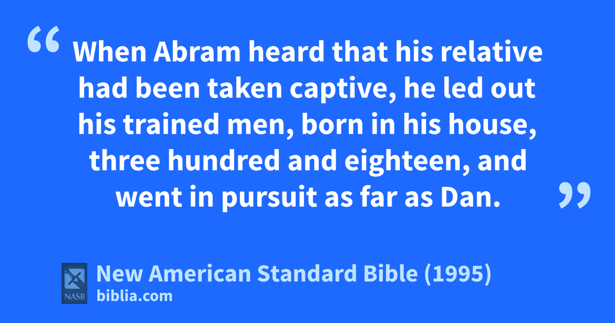 14 When Abram heard that ahis 1relative had been taken captive, he 2led out his trained men, bborn in his house, three hundred and eighteen, and went in pursuit as far as cDan.