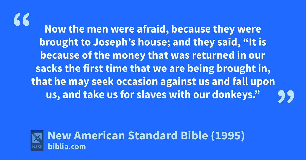 18 Now the men were afraid, because they were brought to Joseph’s house; and they said, “It is because of the money that was returned in our sacks the first time that we are being brought in, that he may 1seek occasion against us and fall upon us, and take us for slaves with our donkeys.”