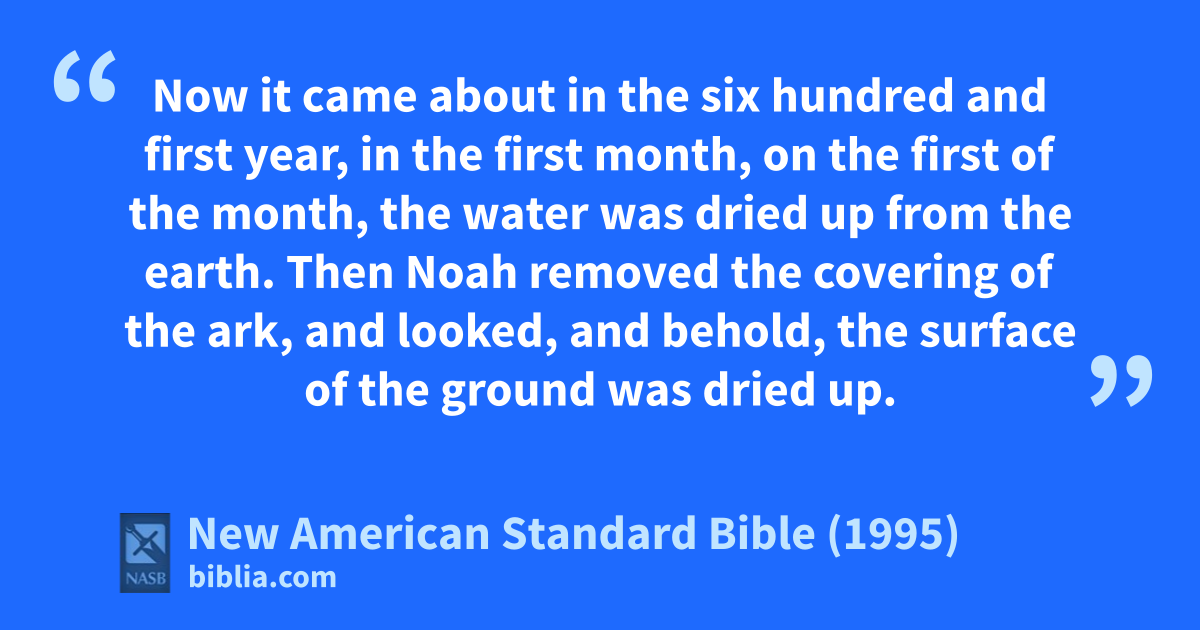 13 Now it came about in the asix hundred and first year, in the first month, on the first of the month, the water was dried up 1from the earth. Then Noah removed the covering of the ark, and looked, and behold, the 2surface of the ground was dried up.