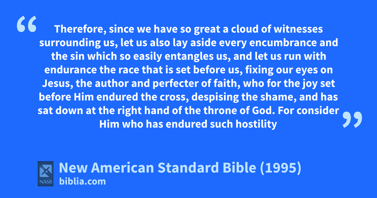1 Therefore, since we have so great a cloud of witnesses surrounding us, let us also alay aside every encumbrance and the sin which so easily entangles us, and let us brun with cendurance the race that is set before us,