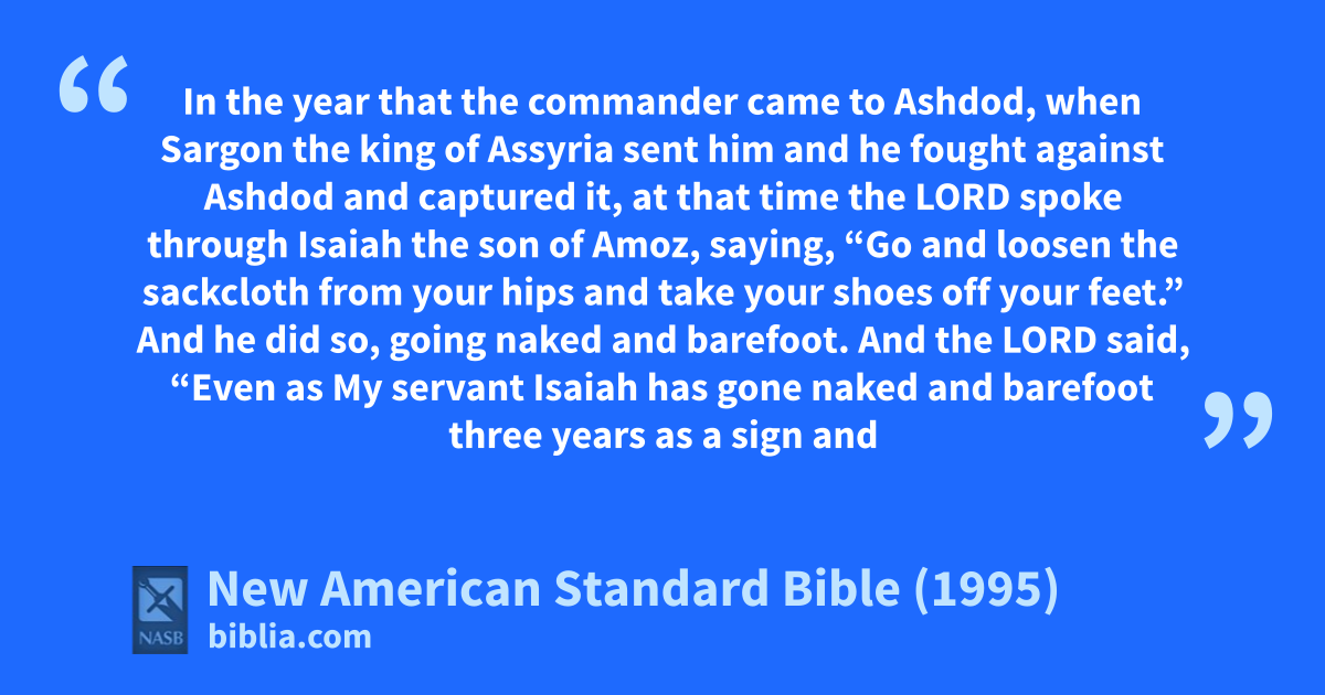 2 at that time the Lord spoke through aIsaiah the son of Amoz, saying, “Go and loosen the bsackcloth from your hips and take your cshoes off your feet.” And he did so, going dnaked and barefoot.