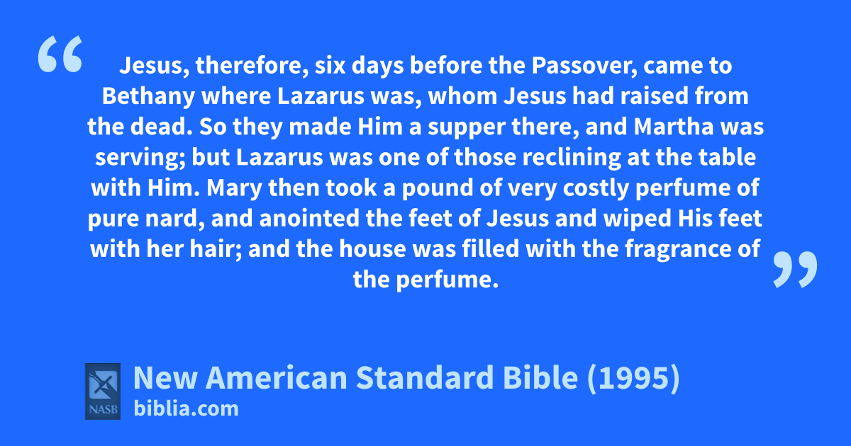 1 aJesus, therefore, six days before bthe Passover, came to cBethany where Lazarus was, whom Jesus had raised from the dead.