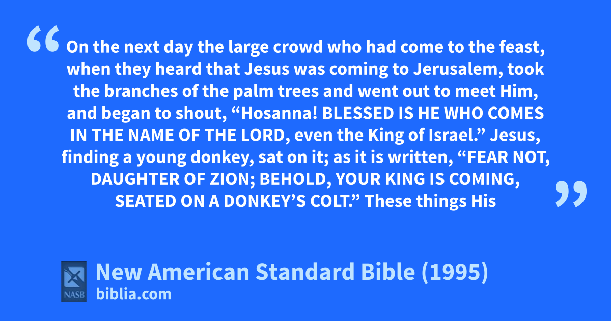13 took the branches of the palm trees and went out to meet Him, and began to shout, “aHosanna! Blessed is He who comes in the name of the Lord, even the bKing of Israel.”