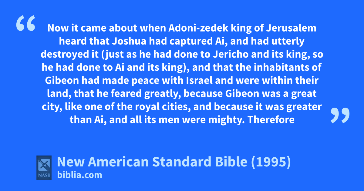 1 Now it came about when Adoni-zedek king of Jerusalem heard that Joshua had captured Ai, and had 1utterly destroyed it (just aas he had done to Jericho and its king, so he had done to Ai and its king), and that the inhabitants of Gibeon had bmade peace with Israel and were 2within their land,