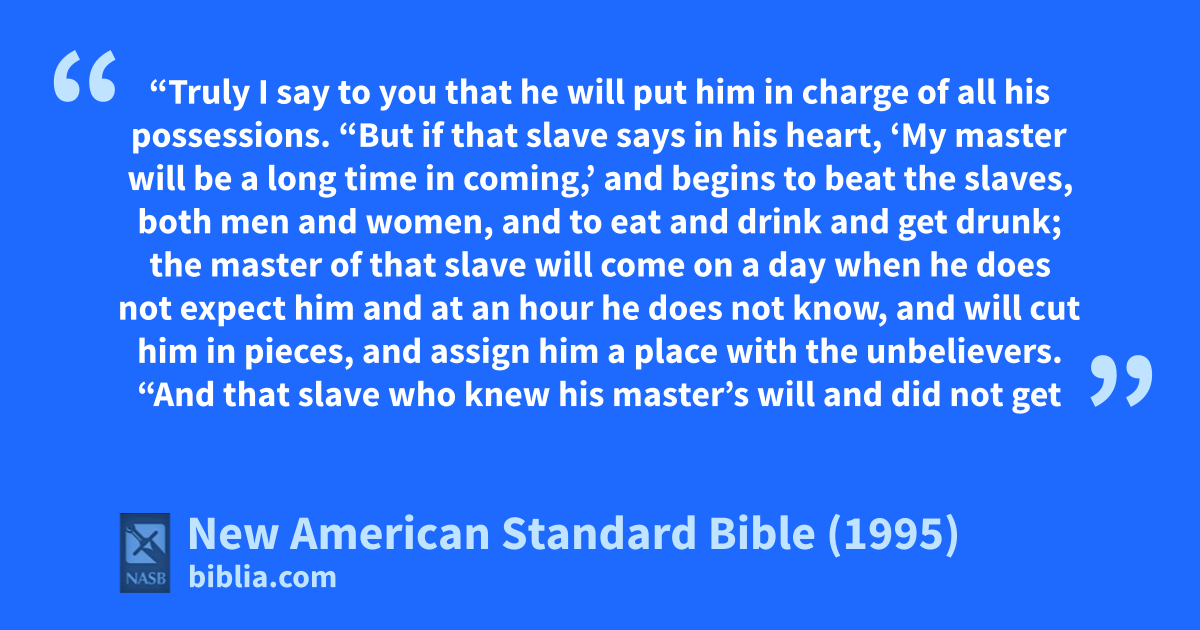 46 the master of that slave will come on a day when he does not expect him and at an hour he does not know, and will cut him in pieces, and assign him a place with the unbelievers.