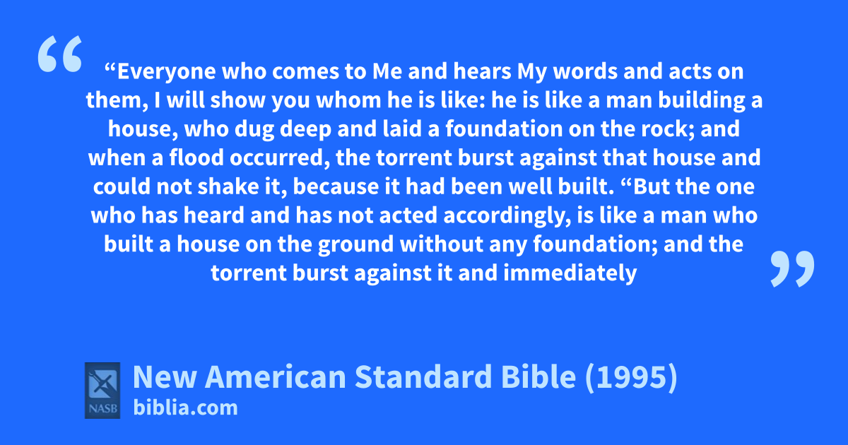 48 he is like a man building a house, who 1dug deep and laid a foundation on the rock; and when a flood occurred, the 2torrent burst against that house and could not shake it, because it had been well built.