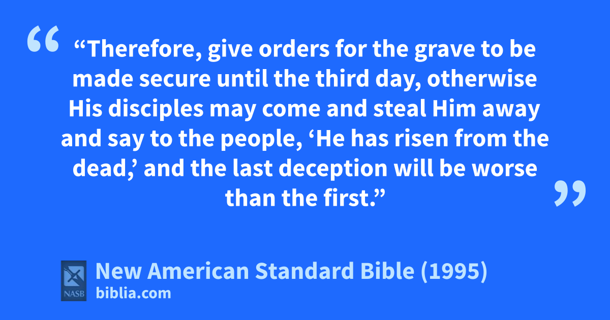 64 “Therefore, give orders for the grave to be made secure until the third day, otherwise His disciples may come and steal Him away and say to the people, ‘He has risen from the dead,’ and the last deception will be worse than the first.”
