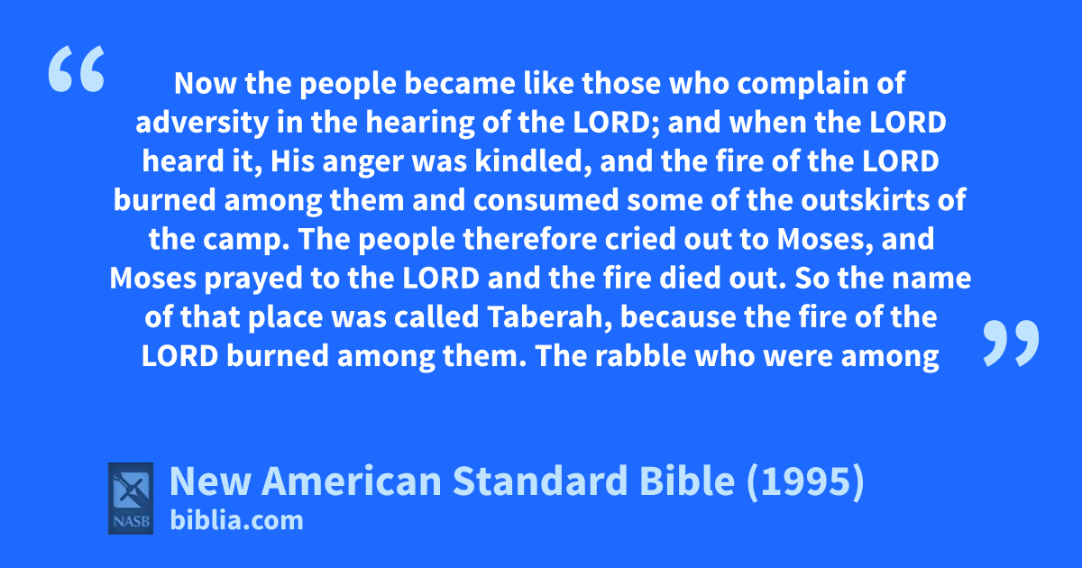 1 Now the people became like athose who complain of adversity bin the hearing of the Lord; and when the Lord heard it, His anger was kindled, and the fire of the Lord burned among them and consumed some of the outskirts of the camp.