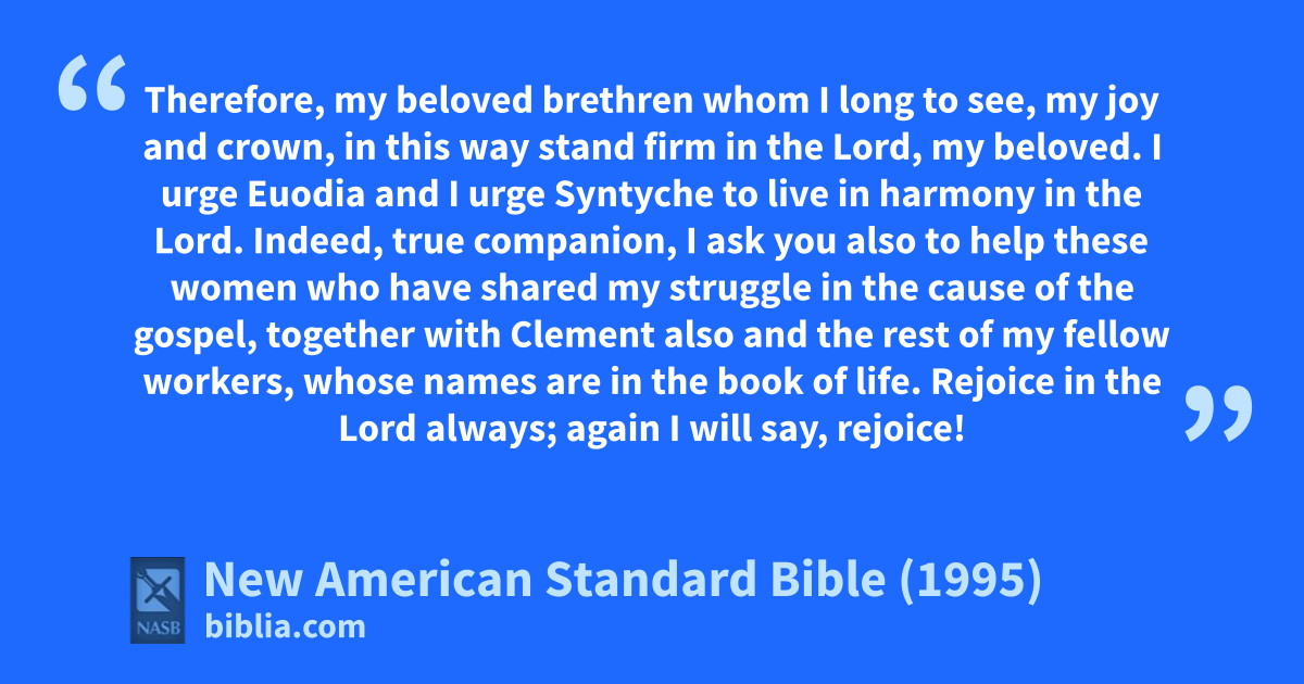 1 Therefore, my beloved brethren 1whom I along to see, my joy and crown, in this way bstand firm in the Lord, my beloved.