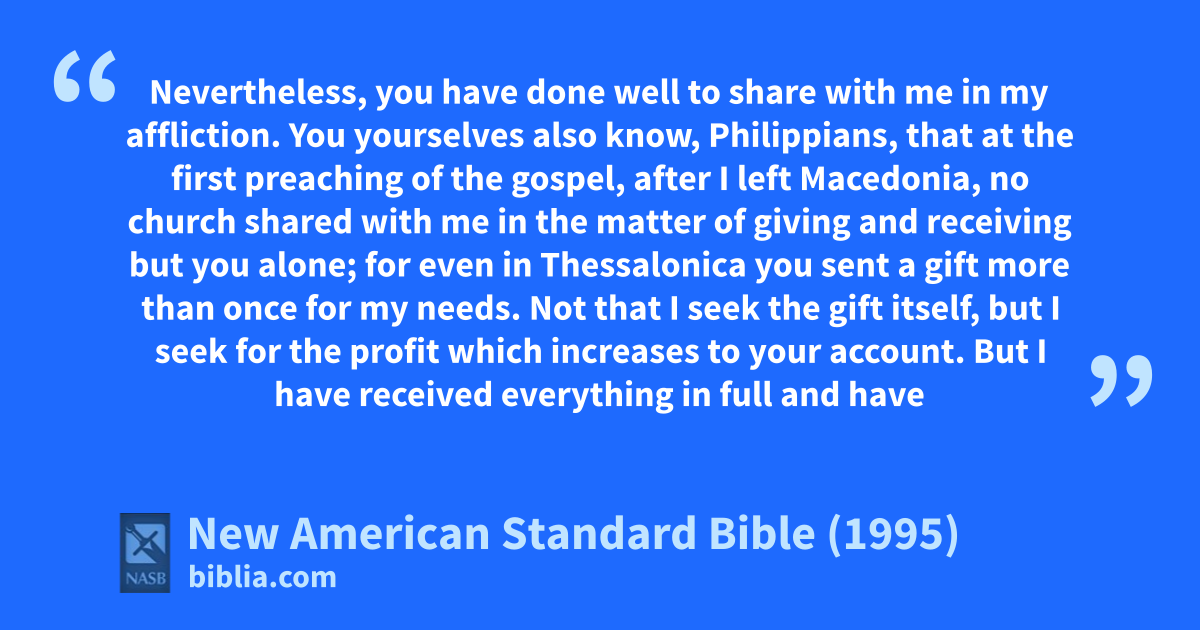 15 You yourselves also know, Philippians, that at the 1afirst preaching of the gospel, after I left bMacedonia, no church cshared with me in the matter of giving and receiving but you alone;