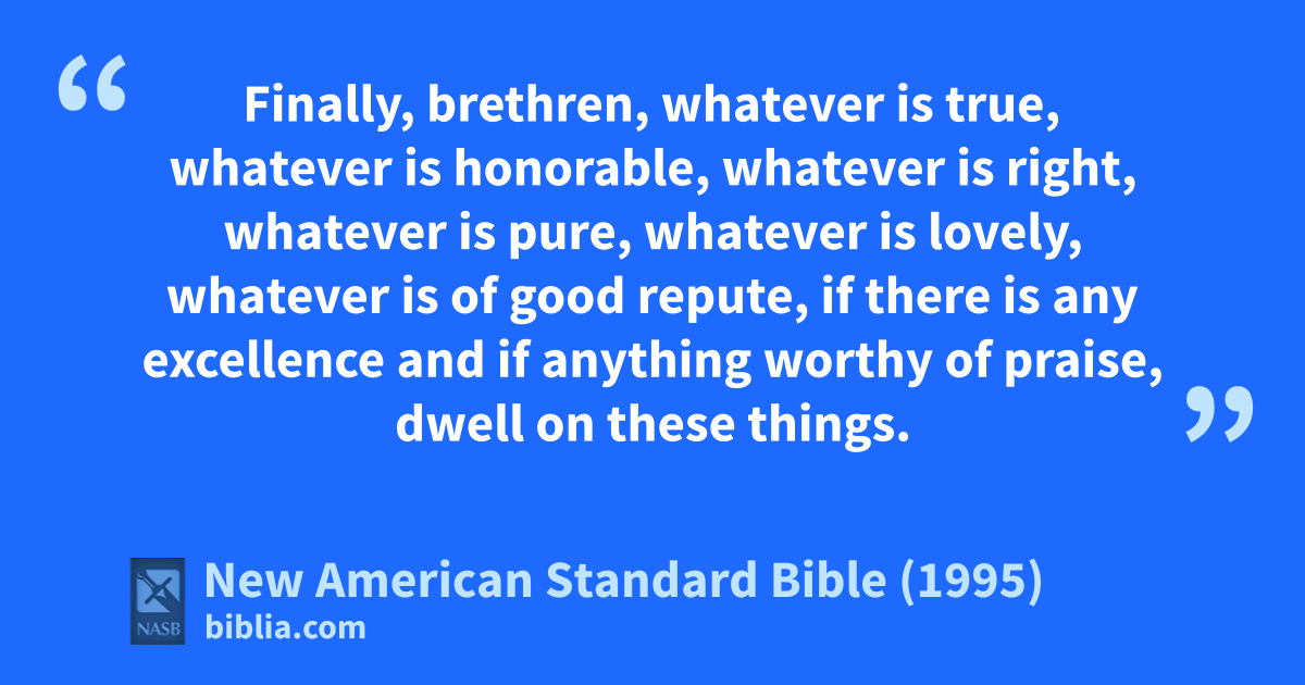 8 Finally, brethren, awhatever is true, whatever is honorable, whatever is right, whatever is pure, whatever is 1lovely, whatever is of good repute, if there is any excellence and if anything worthy of praise, 2dwell on these things.
