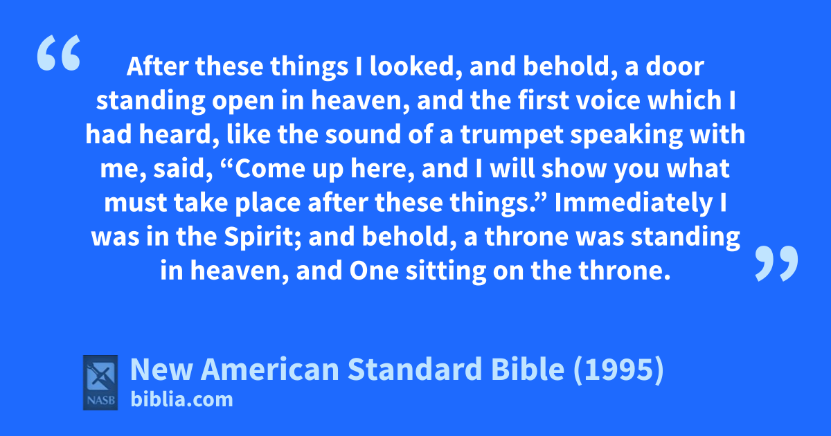 1 After athese things I looked, and behold, ba door standing open in heaven, and the first voice which I had heard, clike the sound of a trumpet speaking with me, said, “dCome up here, and I will eshow you what must take place after these things.”