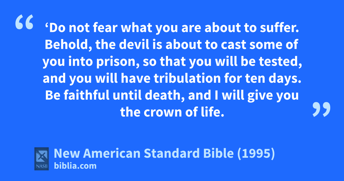 10 ‘Do not fear what you are about to suffer. Behold, the devil is about to cast some of you into prison, so that you will be atested, and you will have tribulation bfor ten days. 1Be cfaithful until death, and I will give you dthe crown of life.