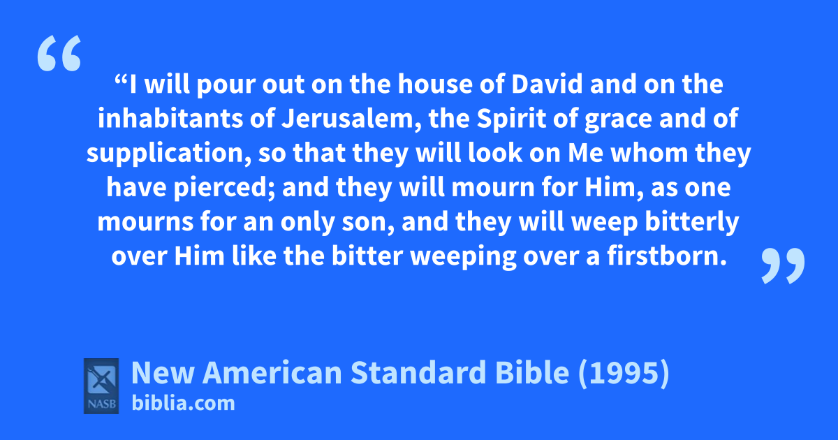 10 “I will apour out on the house of David and on the inhabitants of Jerusalem, 1the Spirit of grace and of supplication, so that they will look on Me whom they have bpierced; and they will mourn for Him, as one cmourns for an only son, and they will weep bitterly over Him like the bitter weeping over a firstborn.