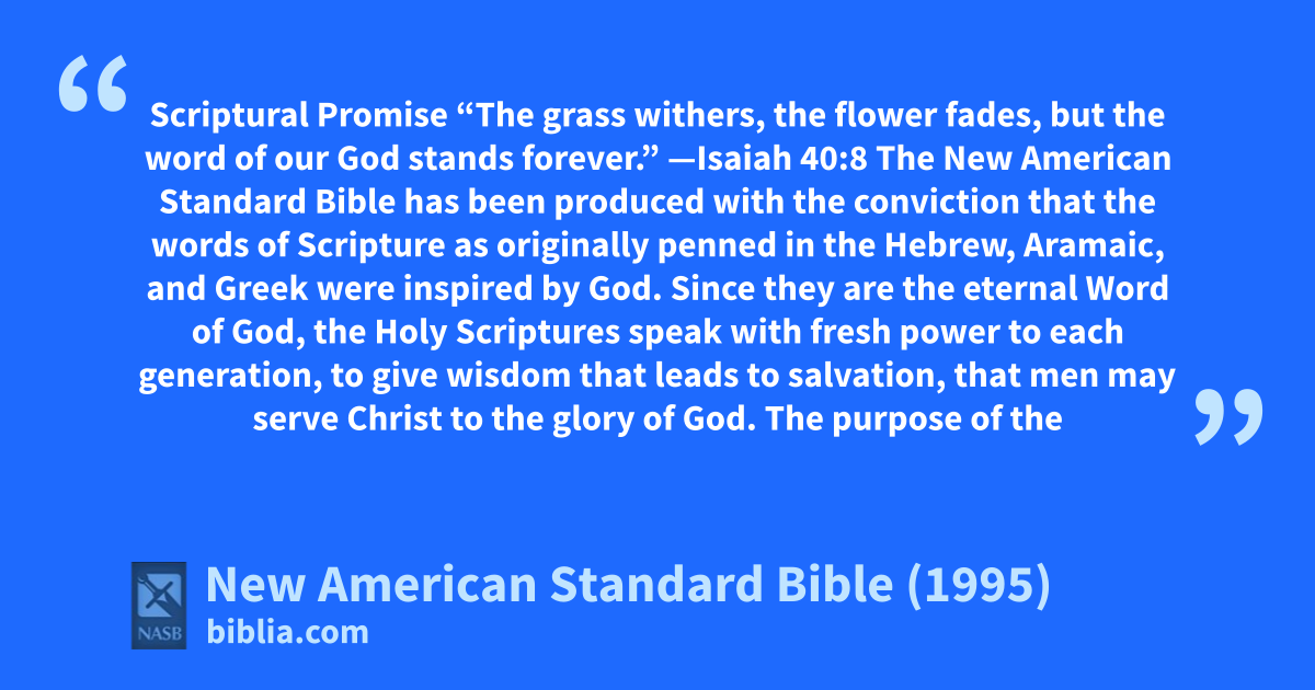 The New American Standard Bible has been produced with the conviction that the words of Scripture as originally penned in the Hebrew, Aramaic, and Greek were inspired by God. Since they are the eternal Word of God, the Holy Scriptures speak with fresh power to each generation, to give wisdom that leads to salvation, that men may serve Christ to the glory of God.