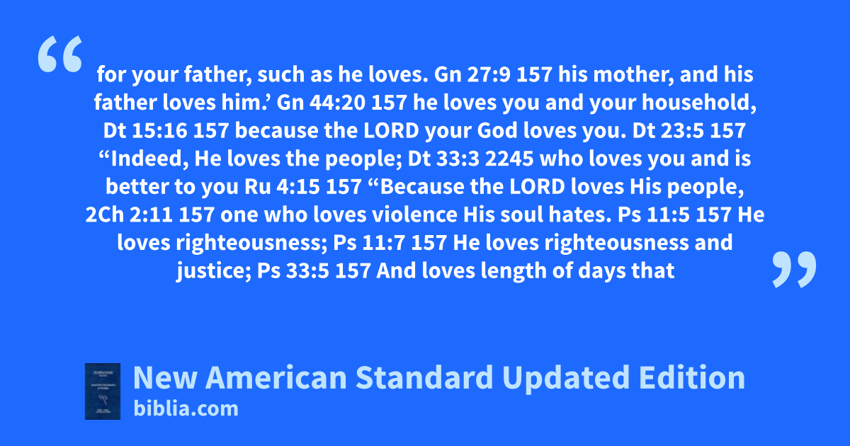 for your father, such as he loves. Gn 27:9 157 his mother, and his father loves him.’ Gn 44:20 157 he loves you and your household, Dt 15:16 157 because the LORD your God loves you. Dt 23:5 157 “Indeed, He loves the people; Dt 33:3 2245 who loves you and is better to you Ru 4:15 157 “Because the LORD loves His people, 2Ch 2:11 157 one who loves violence His soul hates. Ps 11:5 157 He loves righteousness; Ps 11:7 157 He loves righteousness and justice; Ps 33:5 157 And loves length of days that
