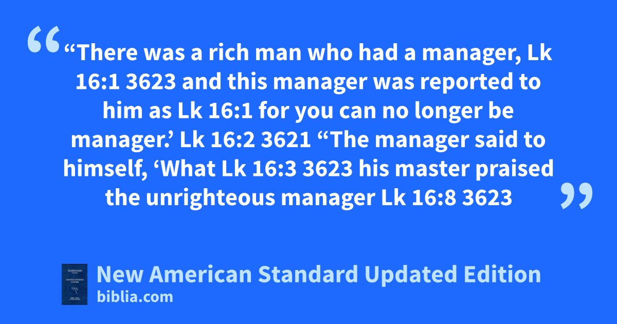 “There was a rich man who had a manager, Lk 16:1 3623 and this manager was reported to him as Lk 16:1 for you can no longer be manager.’ Lk 16:2 3621 “The manager said to himself, ‘What Lk 16:3 3623 his master praised the unrighteous manager Lk 16:8 3623