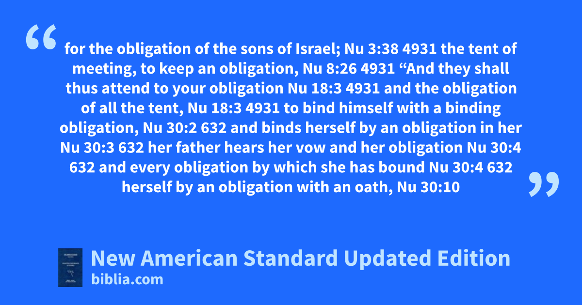 for the obligation of the sons of Israel; Nu 3:38 4931 the tent of meeting, to keep an obligation, Nu 8:26 4931 “And they shall thus attend to your obligation Nu 18:3 4931 and the obligation of all the tent, Nu 18:3 4931 to bind himself with a binding obligation, Nu 30:2 632 and binds herself by an obligation in her Nu 30:3 632 her father hears her vow and her obligation Nu 30:4 632 and every obligation by which she has bound Nu 30:4 632 herself by an obligation with an oath, Nu 30:10