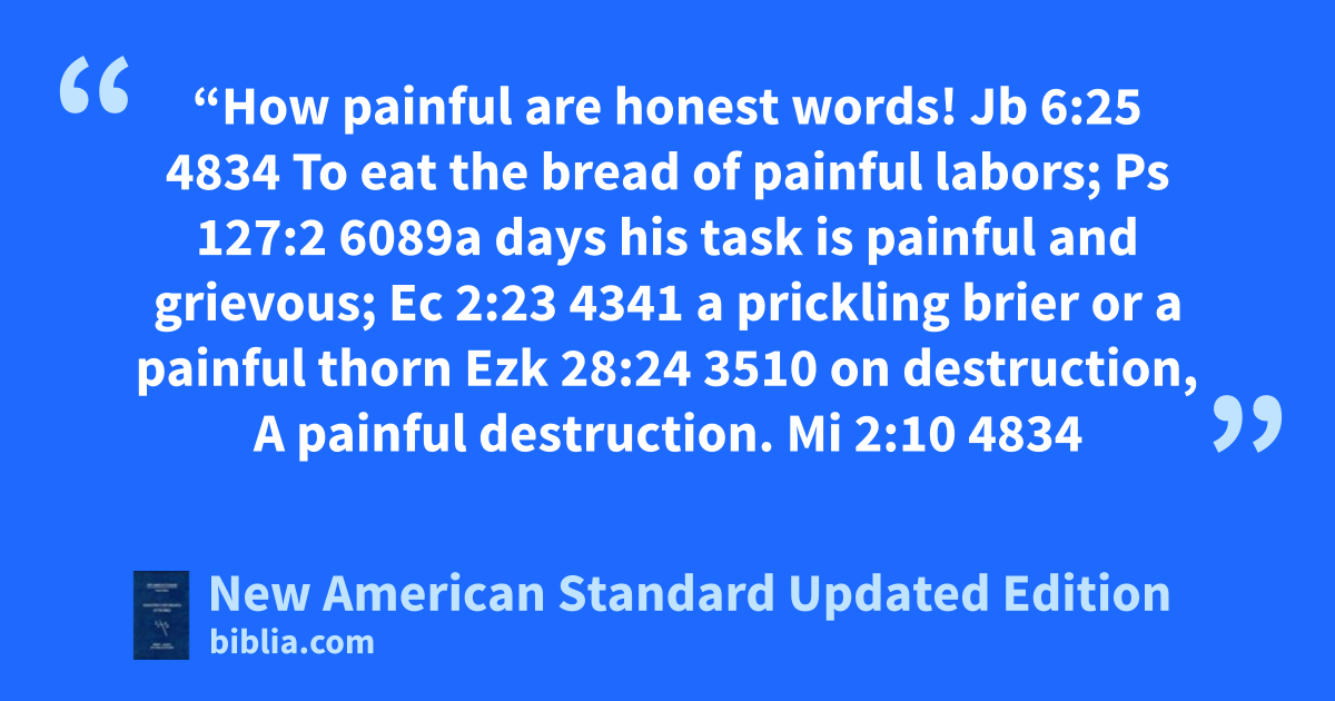 “How painful are honest words! Jb 6:25 4834 To eat the bread of painful labors; Ps 127:2 6089a days his task is painful and grievous; Ec 2:23 4341 a prickling brier or a painful thorn Ezk 28:24 3510 on destruction, A painful destruction. Mi 2:10 4834