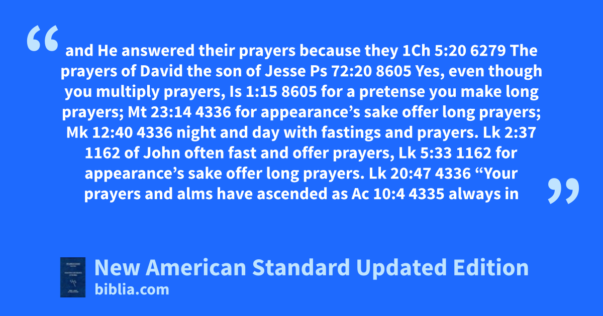 and He answered their prayers because they 1Ch 5:20 6279 The prayers of David the son of Jesse Ps 72:20 8605 Yes, even though you multiply prayers, Is 1:15 8605 for a pretense you make long prayers; Mt 23:14 4336 for appearance’s sake offer long prayers; Mk 12:40 4336 night and day with fastings and prayers. Lk 2:37 1162 of John often fast and offer prayers, Lk 5:33 1162 for appearance’s sake offer long prayers. Lk 20:47 4336 “Your prayers and alms have ascended as Ac 10:4 4335 always in