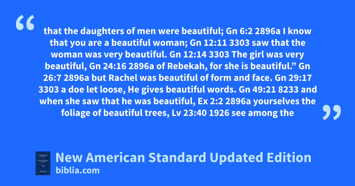 that the daughters of men were beautiful; Gn 6:2 2896a I know that you are a beautiful woman; Gn 12:11 3303 saw that the woman was very beautiful. Gn 12:14 3303 The girl was very beautiful, Gn 24:16 2896a of Rebekah, for she is beautiful.” Gn 26:7 2896a but Rachel was beautiful of form and face. Gn 29:17 3303 a doe let loose, He gives beautiful words. Gn 49:21 8233 and when she saw that he was beautiful, Ex 2:2 2896a yourselves the foliage of beautiful trees, Lv 23:40 1926 see among the