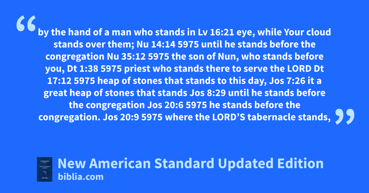 by the hand of a man who stands in Lv 16:21 eye, while Your cloud stands over them; Nu 14:14 5975 until he stands before the congregation Nu 35:12 5975 the son of Nun, who stands before you, Dt 1:38 5975 priest who stands there to serve the LORD Dt 17:12 5975 heap of stones that stands to this day, Jos 7:26 it a great heap of stones that stands Jos 8:29 until he stands before the congregation Jos 20:6 5975 he stands before the congregation. Jos 20:9 5975 where the LORD’S tabernacle stands,