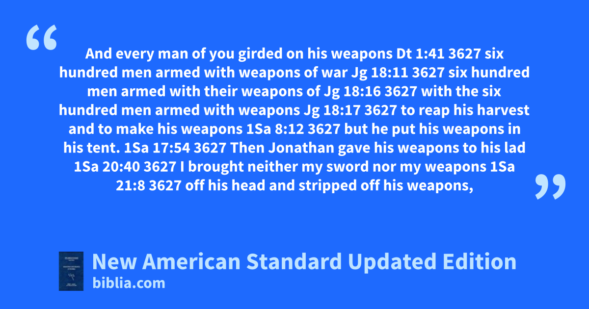 And every man of you girded on his weapons Dt 1:41 3627 six hundred men armed with weapons of war Jg 18:11 3627 six hundred men armed with their weapons of Jg 18:16 3627 with the six hundred men armed with weapons Jg 18:17 3627 to reap his harvest and to make his weapons 1Sa 8:12 3627 but he put his weapons in his tent. 1Sa 17:54 3627 Then Jonathan gave his weapons to his lad 1Sa 20:40 3627 I brought neither my sword nor my weapons 1Sa 21:8 3627 off his head and stripped off his weapons,