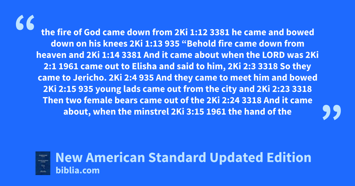 the fire of God came down from 2Ki 1:12 3381 he came and bowed down on his knees 2Ki 1:13 935 “Behold fire came down from heaven and 2Ki 1:14 3381 And it came about when the LORD was 2Ki 2:1 1961 came out to Elisha and said to him, 2Ki 2:3 3318 So they came to Jericho. 2Ki 2:4 935 And they came to meet him and bowed 2Ki 2:15 935 young lads came out from the city and 2Ki 2:23 3318 Then two female bears came out of the 2Ki 2:24 3318 And it came about, when the minstrel 2Ki 3:15 1961 the hand of the