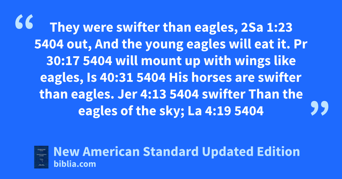 They were swifter than eagles, 2Sa 1:23 5404 out, And the young eagles will eat it. Pr 30:17 5404 will mount up with wings like eagles, Is 40:31 5404 His horses are swifter than eagles. Jer 4:13 5404 swifter Than the eagles of the sky; La 4:19 5404