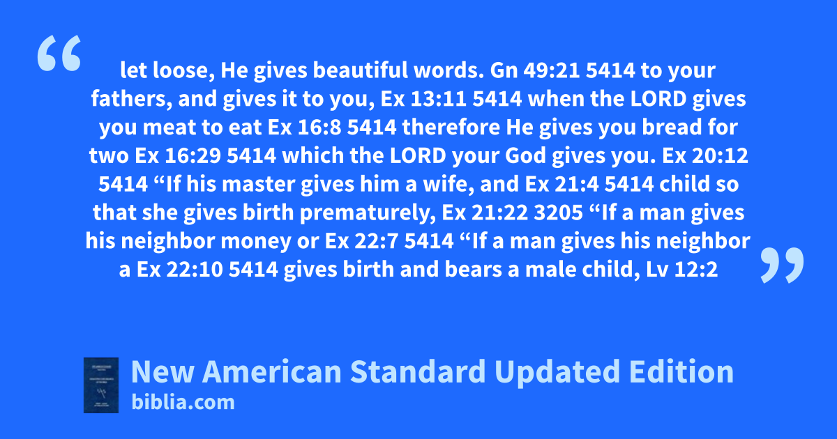 let loose, He gives beautiful words. Gn 49:21 5414 to your fathers, and gives it to you, Ex 13:11 5414 when the LORD gives you meat to eat Ex 16:8 5414 therefore He gives you bread for two Ex 16:29 5414 which the LORD your God gives you. Ex 20:12 5414 “If his master gives him a wife, and Ex 21:4 5414 child so that she gives birth prematurely, Ex 21:22 3205 “If a man gives his neighbor money or Ex 22:7 5414 “If a man gives his neighbor a Ex 22:10 5414 gives birth and bears a male child, Lv 12:2