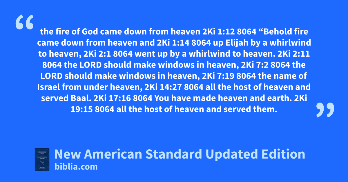 the fire of God came down from heaven 2Ki 1:12 8064 “Behold fire came down from heaven and 2Ki 1:14 8064 up Elijah by a whirlwind to heaven, 2Ki 2:1 8064 went up by a whirlwind to heaven. 2Ki 2:11 8064 the LORD should make windows in heaven, 2Ki 7:2 8064 the LORD should make windows in heaven, 2Ki 7:19 8064 the name of Israel from under heaven, 2Ki 14:27 8064 all the host of heaven and served Baal. 2Ki 17:16 8064 You have made heaven and earth. 2Ki 19:15 8064 all the host of heaven and served them.