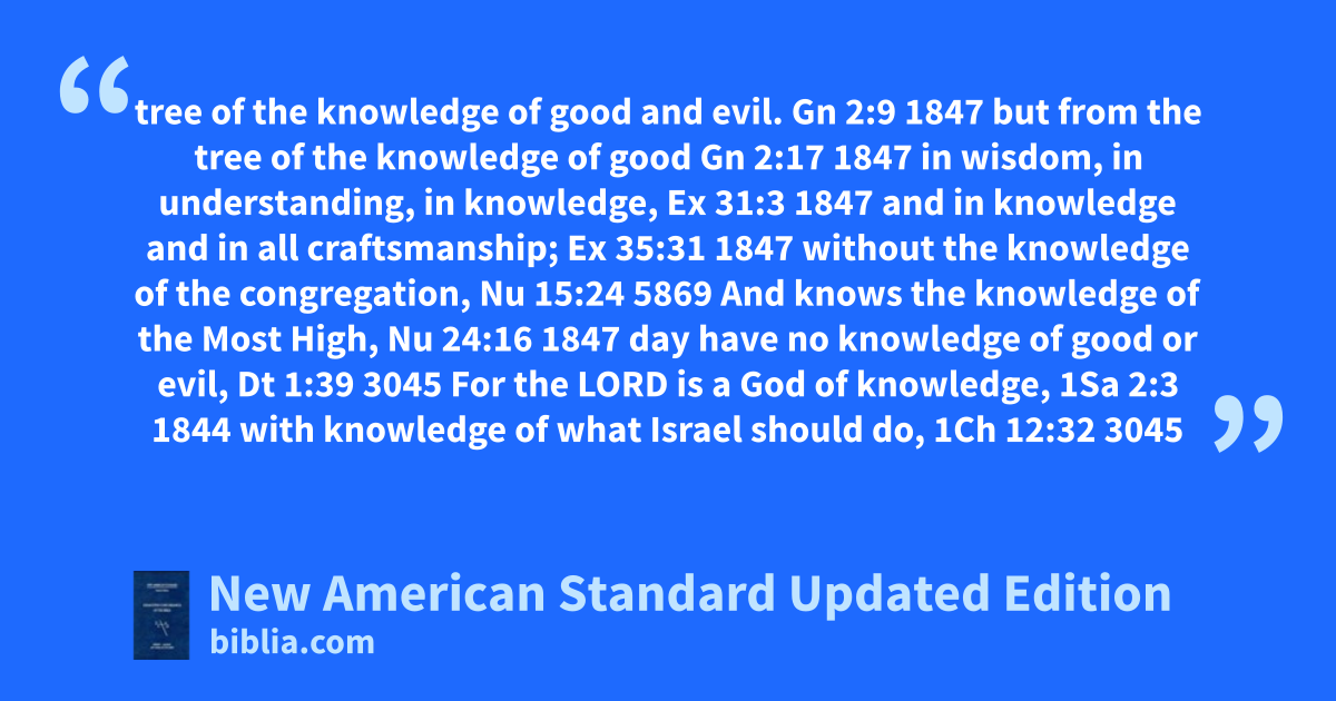 tree of the knowledge of good and evil. Gn 2:9 1847 but from the tree of the knowledge of good Gn 2:17 1847 in wisdom, in understanding, in knowledge, Ex 31:3 1847 and in knowledge and in all craftsmanship; Ex 35:31 1847 without the knowledge of the congregation, Nu 15:24 5869 And knows the knowledge of the Most High, Nu 24:16 1847 day have no knowledge of good or evil, Dt 1:39 3045 For the LORD is a God of knowledge, 1Sa 2:3 1844 with knowledge of what Israel should do, 1Ch 12:32 3045