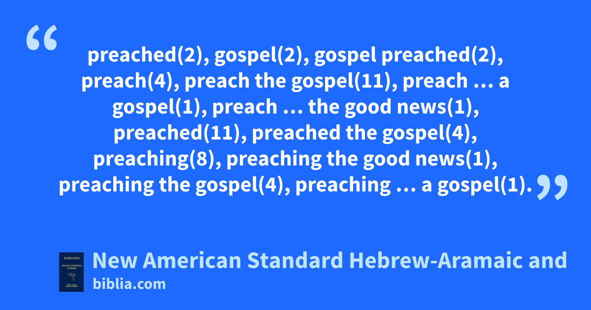 preached(2), gospel(2), gospel preached(2), preach(4), preach the gospel(11), preach … a gospel(1), preach … the good news(1), preached(11), preached the gospel(4), preaching(8), preaching the good news(1), preaching the gospel(4), preaching … a gospel(1).