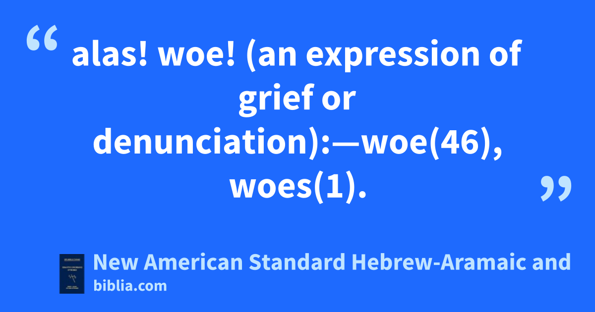 alas! woe! (an expression of grief or denunciation):—woe(46), woes(1).