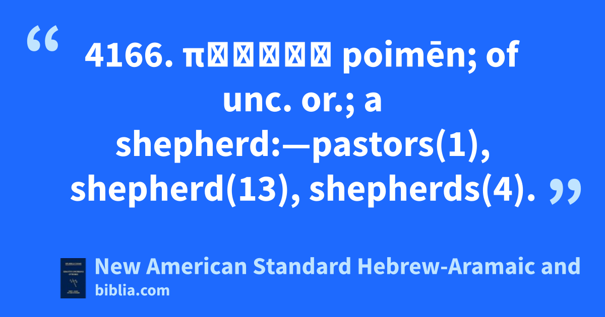 4166. ποιμήν poimēn; of unc. or.; a shepherd:—pastors(1), shepherd(13), shepherds(4).