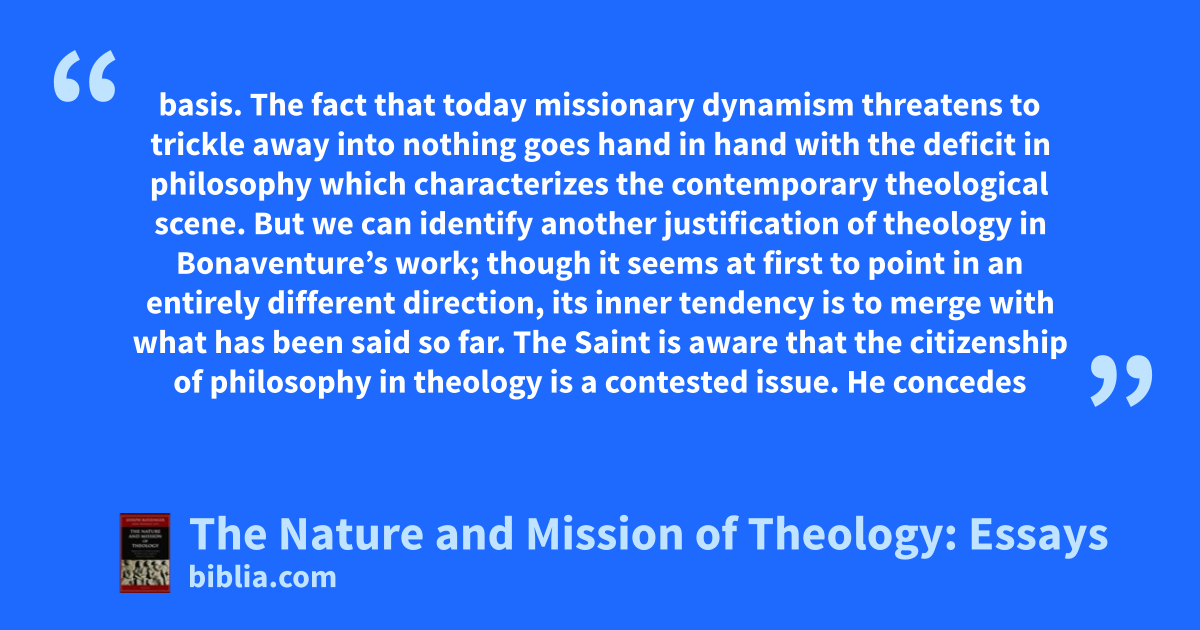 basis. The fact that today missionary dynamism threatens to trickle away into nothing goes hand in hand with the deficit in philosophy which characterizes the contemporary theological scene. But we can identify another justification of theology in Bonaventure’s work; though it seems at first to point in an entirely different direction, its inner tendency is to merge with what has been said so far. The Saint is aware that the citizenship of philosophy in theology is a contested issue. He concedes