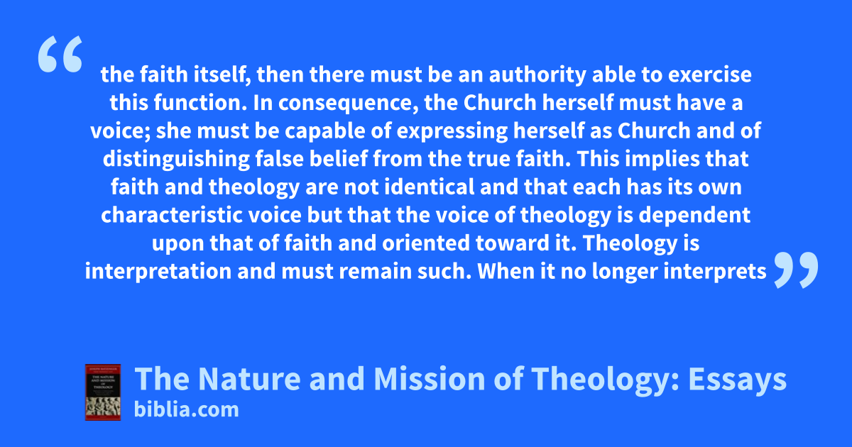the faith itself, then there must be an authority able to exercise this function. In consequence, the Church herself must have a voice; she must be capable of expressing herself as Church and of distinguishing false belief from the true faith. This implies that faith and theology are not identical and that each has its own characteristic voice but that the voice of theology is dependent upon that of faith and oriented toward it. Theology is interpretation and must remain such. When it no longer interprets