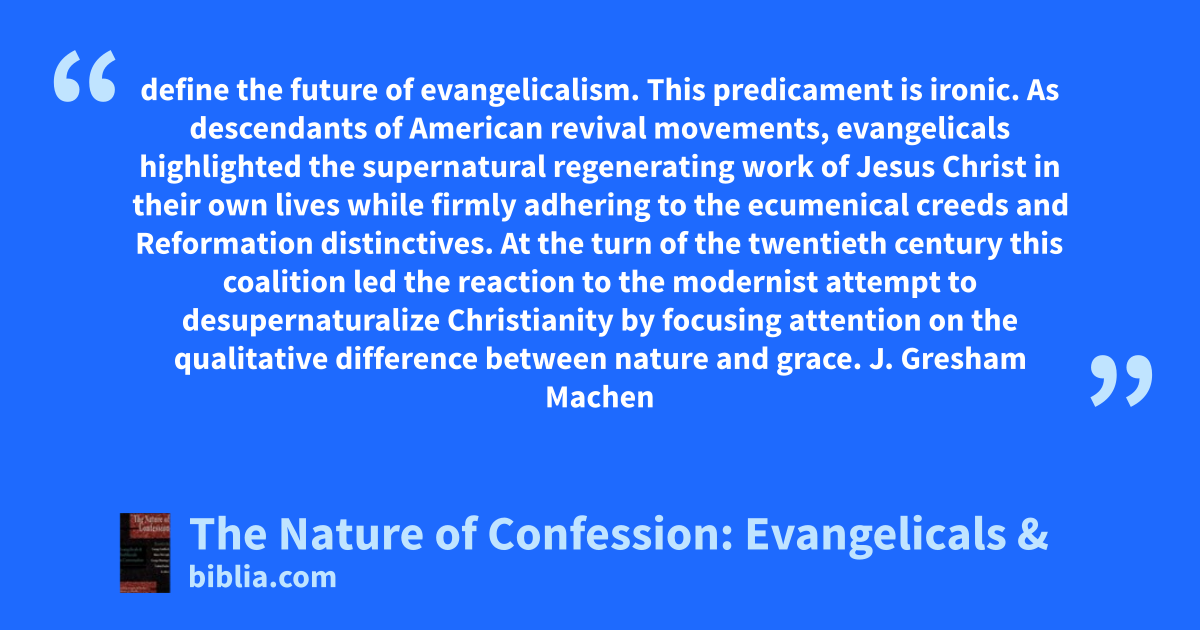 define the future of evangelicalism. This predicament is ironic. As descendants of American revival movements, evangelicals highlighted the supernatural regenerating work of Jesus Christ in their own lives while firmly adhering to the ecumenical creeds and Reformation distinctives. At the turn of the twentieth century this coalition led the reaction to the modernist attempt to desupernaturalize Christianity by focusing attention on the qualitative difference between nature and grace. J. Gresham Machen