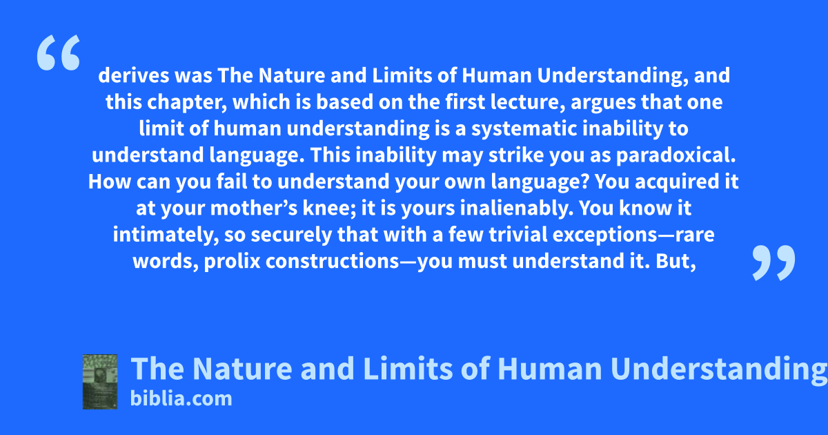 derives was The Nature and Limits of Human Understanding, and this chapter, which is based on the first lecture, argues that one limit of human understanding is a systematic inability to understand language. This inability may strike you as paradoxical. How can you fail to understand your own language? You acquired it at your mother’s knee; it is yours inalienably. You know it intimately, so securely that with a few trivial exceptions—rare words, prolix constructions—you must understand it. But,