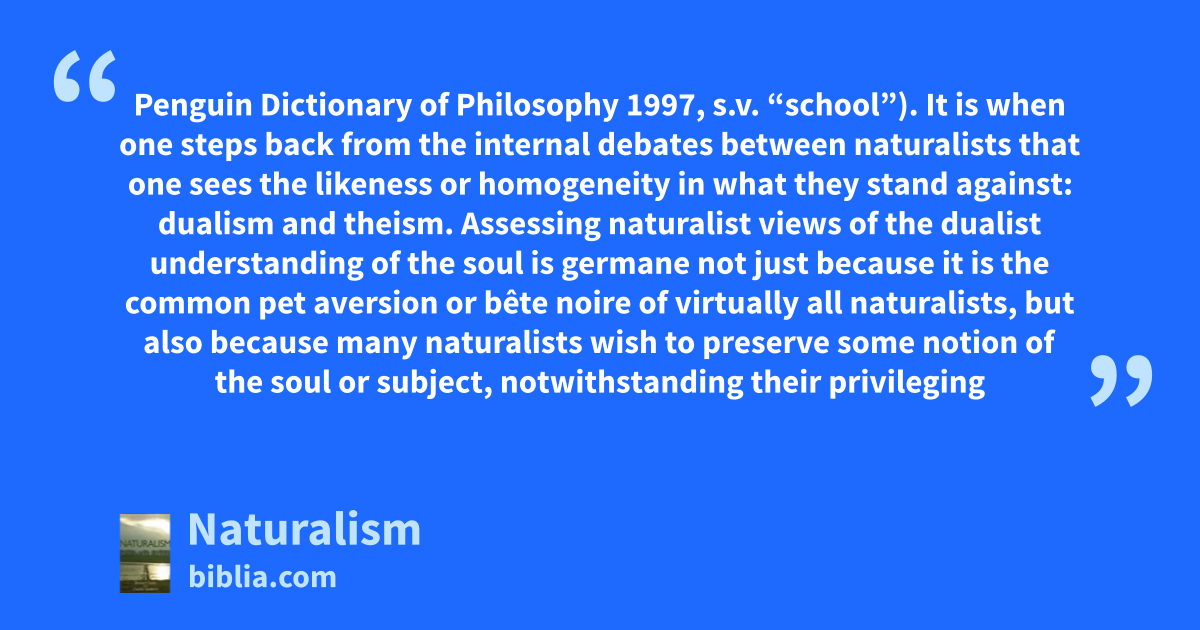 Penguin Dictionary of Philosophy 1997, s.v. “school”). It is when one steps back from the internal debates between naturalists that one sees the likeness or homogeneity in what they stand against: dualism and theism. Assessing naturalist views of the dualist understanding of the soul is germane not just because it is the common pet aversion or bête noire of virtually all naturalists, but also because many naturalists wish to preserve some notion of the soul or subject, notwithstanding their privileging
