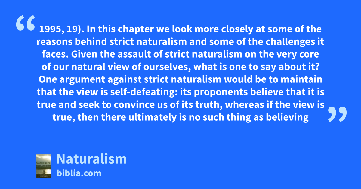 1995, 19). In this chapter we look more closely at some of the reasons behind strict naturalism and some of the challenges it faces. Given the assault of strict naturalism on the very core of our natural view of ourselves, what is one to say about it? One argument against strict naturalism would be to maintain that the view is self-defeating: its proponents believe that it is true and seek to convince us of its truth, whereas if the view is true, then there ultimately is no such thing as believing