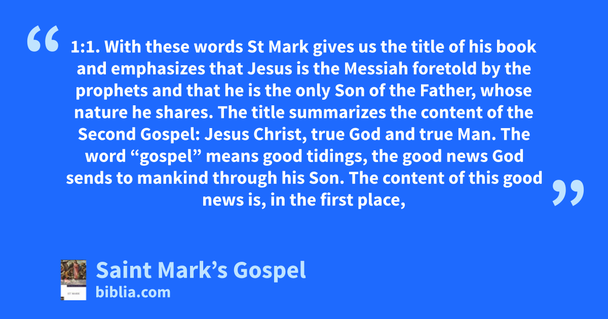 1:1. With these words St Mark gives us the title of his book and emphasizes that Jesus is the Messiah foretold by the prophets and that he is the only Son of the Father, whose nature he shares. The title summarizes the content of the Second Gospel: Jesus Christ, true God and true Man. The word “gospel” means good tidings, the good news God sends to mankind through his Son. The content of this good news is, in the first place,
