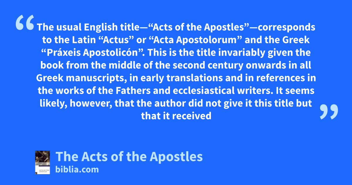 The usual English title—“Acts of the Apostles”—corresponds to the Latin “Actus” or “Acta Apostolorum” and the Greek “Práxeis Apostolicón”. This is the title invariably given the book from the middle of the second century onwards in all Greek manuscripts, in early translations and in references in the works of the Fathers and ecclesiastical writers. It seems likely, however, that the author did not give it this title but that it received