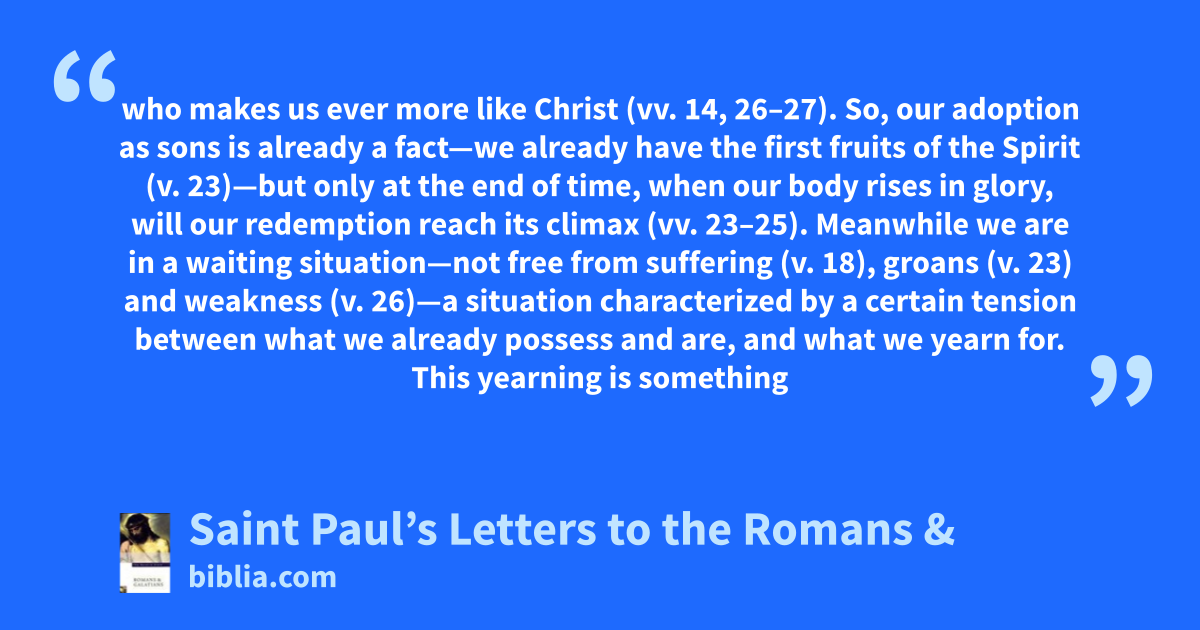 who makes us ever more like Christ (vv. 14, 26–27). So, our adoption as sons is already a fact—we already have the first fruits of the Spirit (v. 23)—but only at the end of time, when our body rises in glory, will our redemption reach its climax (vv. 23–25). Meanwhile we are in a waiting situation—not free from suffering (v. 18), groans (v. 23) and weakness (v. 26)—a situation characterized by a certain tension between what we already possess and are, and what we yearn for. This yearning is something