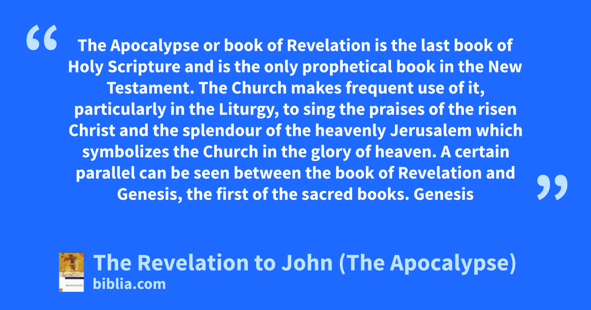 The Apocalypse or book of Revelation is the last book of Holy Scripture and is the only prophetical book in the New Testament. The Church makes frequent use of it, particularly in the Liturgy, to sing the praises of the risen Christ and the splendour of the heavenly Jerusalem which symbolizes the Church in the glory of heaven. A certain parallel can be seen between the book of Revelation and Genesis, the first of the sacred books. Genesis
