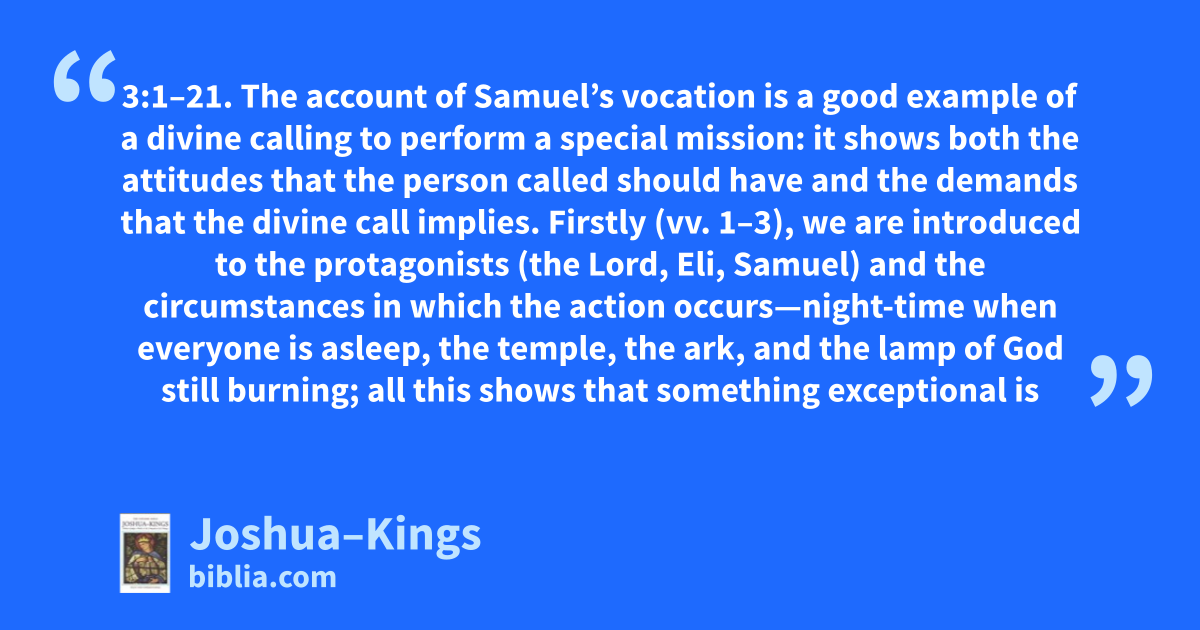 3:1–21. The account of Samuel’s vocation is a good example of a divine calling to perform a special mission: it shows both the attitudes that the person called should have and the demands that the divine call implies. Firstly (vv. 1–3), we are introduced to the protagonists (the Lord, Eli, Samuel) and the circumstances in which the action occurs—night-time when everyone is asleep, the temple, the ark, and the lamp of God still burning; all this shows that something exceptional is