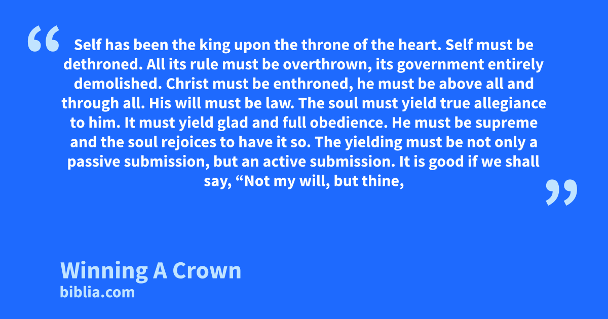 Self has been the king upon the throne of the heart. Self must be dethroned. All its rule must be overthrown, its government entirely demolished. Christ must be enthroned, he must be above all and through all. His will must be law. The soul must yield true allegiance to him. It must yield glad and full obedience. He must be supreme and the soul rejoices to have it so. The yielding must be not only a passive submission, but an active submission. It is good if we shall say, “Not my will, but thine,
